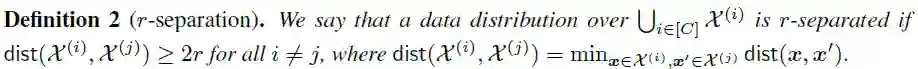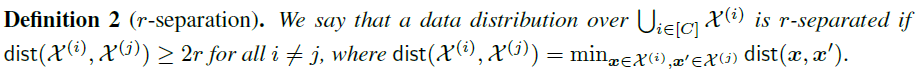 可划分性(Seperation):假设输入空间 包含 个互不相交的子集 ,每个子集 中的样本的标签都是 ,则称满足如下定义的数据分布是 -可分的( -reparation):