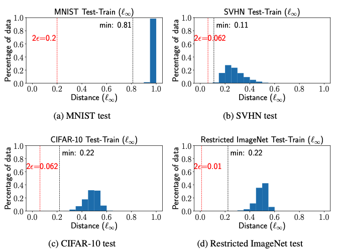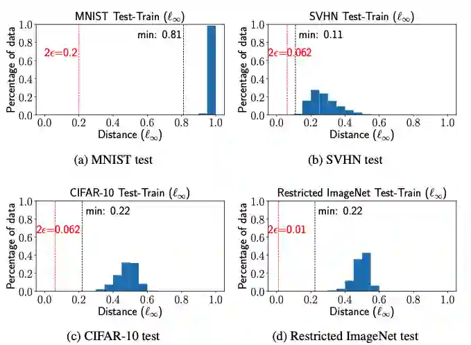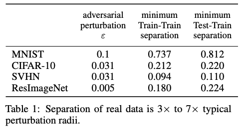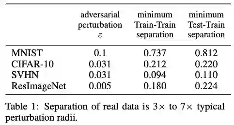 这里距离度量函数 选为 距离, 表示每种数据集在对抗样本实验中常用的扰动半径大小,Train-Train separation表示每个训练样本和离它最近的且具有不同标签的训练样本之间的 距离,Test-Train separation表示每个测试样本和离它最近的且具有不同标签的训练样本之间的 距离。我们可以发现,Train-Train和Test-Train separation都要大于对抗扰动半径 的2倍,由 -separation的定义可知,这些数据集至少是 -可分的。