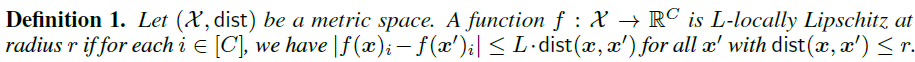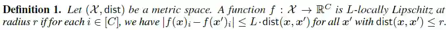 局部利普西斯性(Local Lipschitzness):给定样本输入空间 和一个距离度量函数 , 表示所有标签的集合,则函数 的局部利普西斯性定义为: