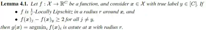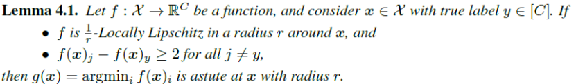 若函数 在 周围半径为 的区域 内满足 - ,并且对于任何非真实标签 的维度 ,都有 ,则上述定义的分类器 在 周围半径为 的区域内可以达到100%的分类准确率,即一定有 ,也就是说 是足够机敏的(astute),实现了鲁棒性和准确率的双赢。