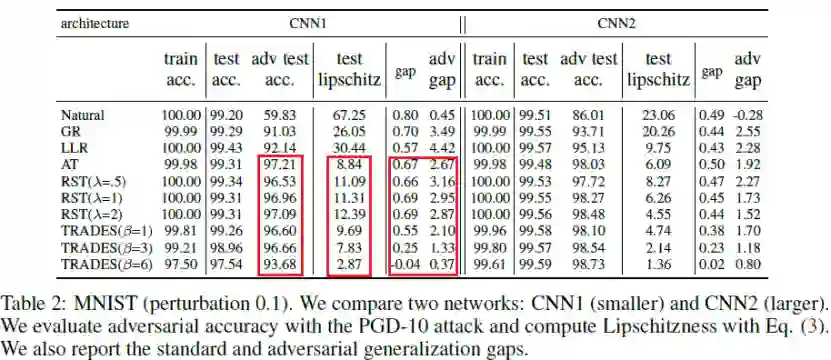 上表显示了两种卷积神经网络在不同的训练方法Natural, GR, LLR, AT, RST, TRADES下的性能,包括在训练集上的准确率,在测试集上的准确率,在测试集对抗样本上的准确率(简称为对抗准确率),利普西斯常数,训练集和测试集准确率的差,训练集和测试集对抗准确率的差。我们发现(1)模型的利普西斯性和其对抗准确率密切相关,比如鲁棒的训练方法AT,RST,TRADES的利普西斯性比Natural, GR, LLR好(即利普西斯常数更小),它们的对抗准确率也较高;(2)尽管模型具有较小的利普斯西常数,更加平滑,但它们在训练集和测试集上的泛化差距依然很大。