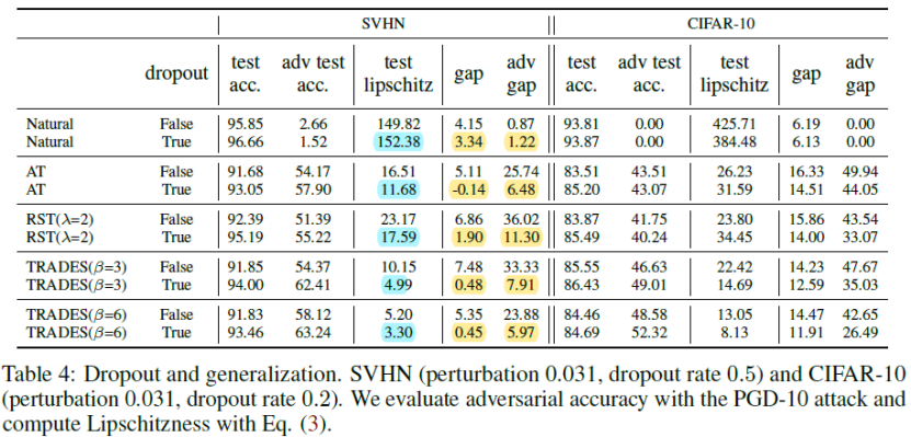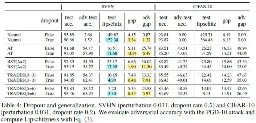 作者研究了现有训练方法产生的分类器的平滑性和泛化差距(训练集和测试集准确率的差距),发现一些能够产生鲁棒分类器的训练方法,依然无法缓解模型具有很大泛化差距的问题。因此,作者提出将dropout技术应用到这些训练方法中来缩小模型的泛化差距,本文实验结果证明了该方法的有效性。