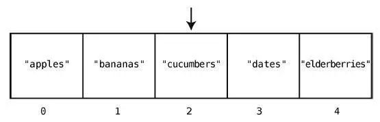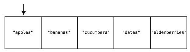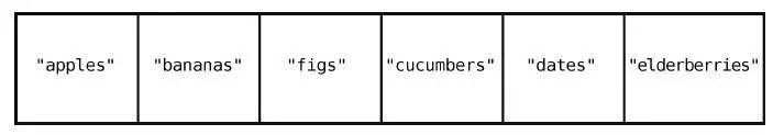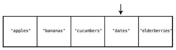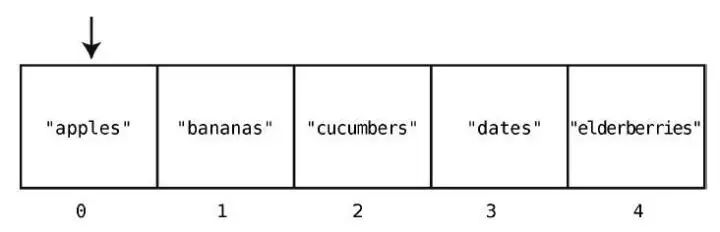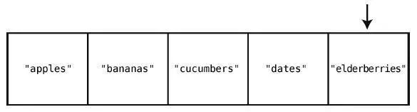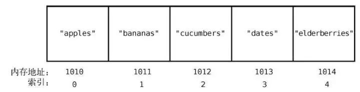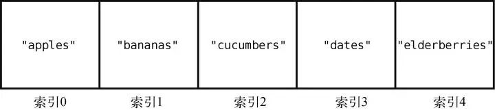在大多数的编程语言中,索引是从0 算起的,因此在这个例子中,"apples"的索引为0,"elderberries"的索引为4,如下所示。