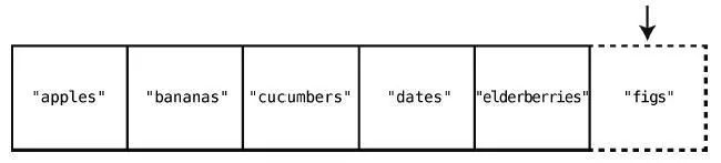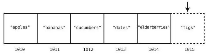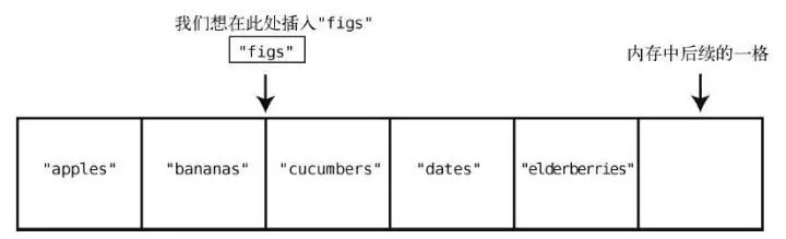 假设我们想要在购物清单的末尾插入"figs"。那么只需一步。因为之前说过了,计算机知道数组开头的内存地址,也知道数组包含多少个元素,所以可以算出要插入的内存地址,然后一步跳到那里插入就行了。图示如下。