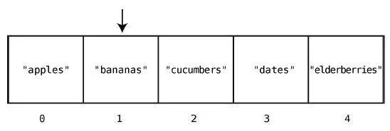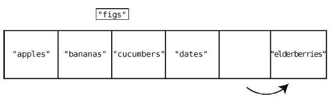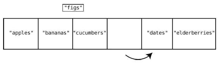 为了达到目的,我们必须先把"cucumbers"、"dates"和"elderberries"往右移,以便空出索引2。而这也不是一步就能移好,因为我们首先要将"elderberries"右移一格,以空出位置给"dates",然后再将"dates"右移,以空出位置给"cucumbers",下面来演示这个过程。