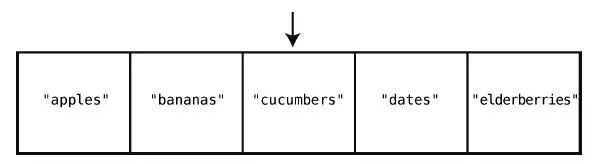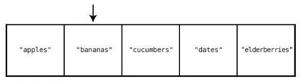 这只要一步就够了,因为计算机本身就有跳到任一索引位置的能力。在["apples","bananas", "cucumbers", "dates", "elderberries"]的例子中,如果要查看索引2 的值,那么计算机就会直接跳到索引2,并告诉你那里有"cucumbers"。