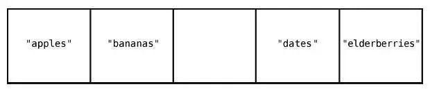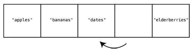 虽然删除"cucumbers"好像一步就搞定了,但这带来了新的问题:数组中间空出了一个格子。因为数组中间是不应该有空格的,所以,我们得把"dates"和"elderberries"往左移。