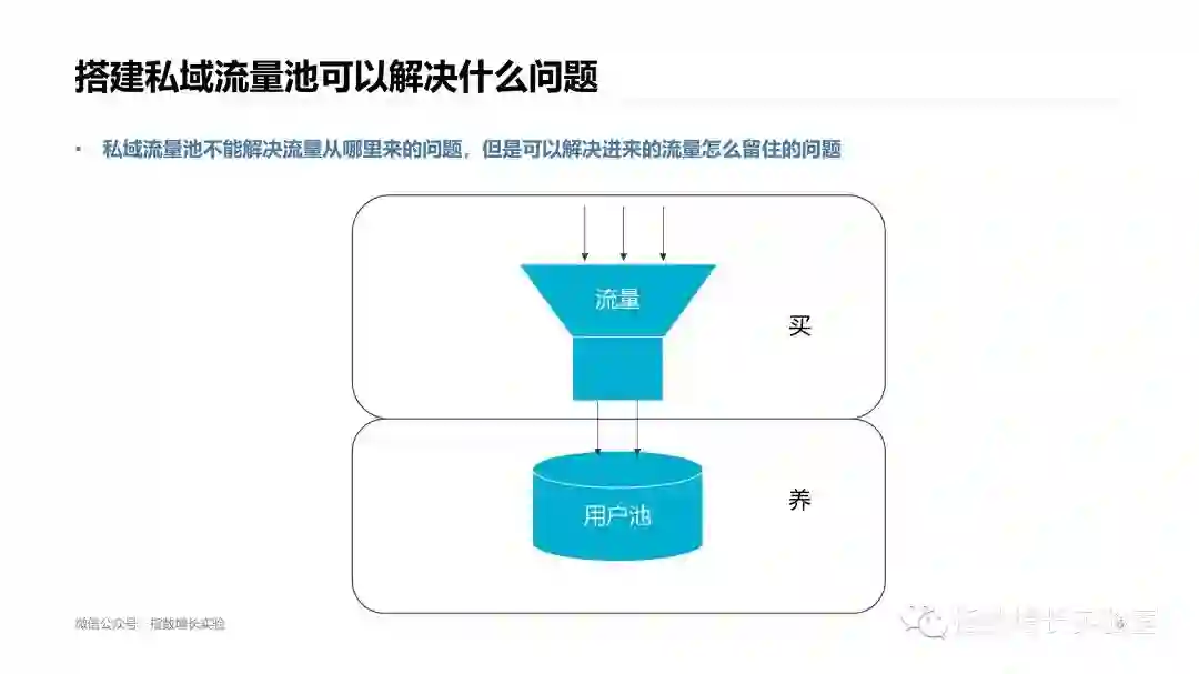 购买进来的流量通过漏斗模型进来之后怎么办?以前我们会选择这些流量作为一次性的流量损失浪费掉,后来我们想办法沉淀到私域流量池。进入私域流量池的流量,请记住,不再是流量,是用户!请一定用户这些翻山越岭来到你这里的用户,通过搭建用户池(也就是私域流量池)把用户养起来。