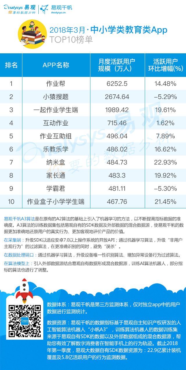 2018年3月,在寒假过后,作业帮的活跃用户规模又迎来了增长,活跃用户数达到了6252.50万人,环比增长14.48%。在产品迭代上,作业帮推出了1对1辅导课,针对性的进行线上教学,更好地提高学习效率,提高学生的学习体验。在活动运营方面,作业帮举行了许多精彩讲座,例如:针对有些爱子心切却不知正确教育方法的家长开设的“万人家长汇”“全国家长会”等教育指南专题讲座,以及《探秘博物馆》、《谁在收藏中国》等精品国学直播课,以优质有趣的内容,全方位地促进孩子们的发展。不仅如此,作业帮也从逐步从线上走向线下,与深受青少年喜爱的《熊出没变形记》、《捉妖记2》等电影进行跨境合作,通过课程活动与电影内容的充分结合,为用户带来了丰富的课外知识,同时也为App吸引了更多的关注。