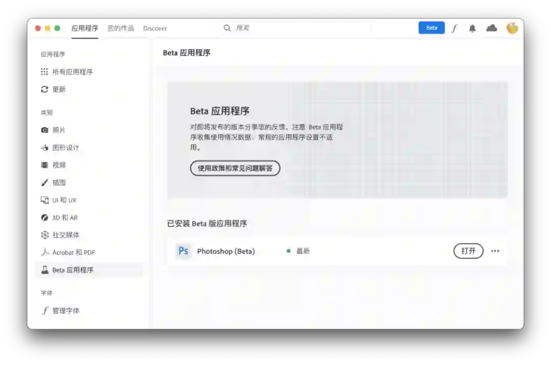 理论上 Rosetta 转译后的应用会有性能折损,但由于 M1 芯片的性能提升非常大(后文会提到),所以在日常使用中感觉不大出来。如果不告诉我应用版本信息根本分不出来哪些是适配过的 M1 版本,哪些是没有适配过的 Intel 版本。唯一比较明显的例子是 Photoshop,在 M1 Mac 中安装最新版本的 Creative Cloud,可以在侧边栏的「Beta 应用程序」里找到已经为 M1 芯片适配过的 Photoshop Beta。一个简单的操作就能看出差别,当我导出图片时,Intel 版本的 Photoshop 会感受到明显的卡顿,而 M1 版本则快很多。