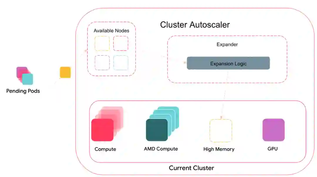 我们对 Cluster Autoscaler 所做的最重要的改进是提供了一种新的方法来确定要扩展的节点组。在内部,Cluster Autoscaler 维护着一个节点组列表(它们映射到不同的候选扩展),它会针对当前的 Pending(不可调度)pod 集进行调度模拟,过滤出不满足 pod 调度需求的节点组。如果有任何 Pending(不可调度)pod,Cluster Autoscaler 会尝试扩展集群以容纳这些 pod。任何满足所有 pod 需求的节点组都会被传递给一个名为 Expander 的组件。