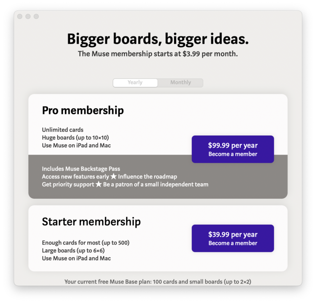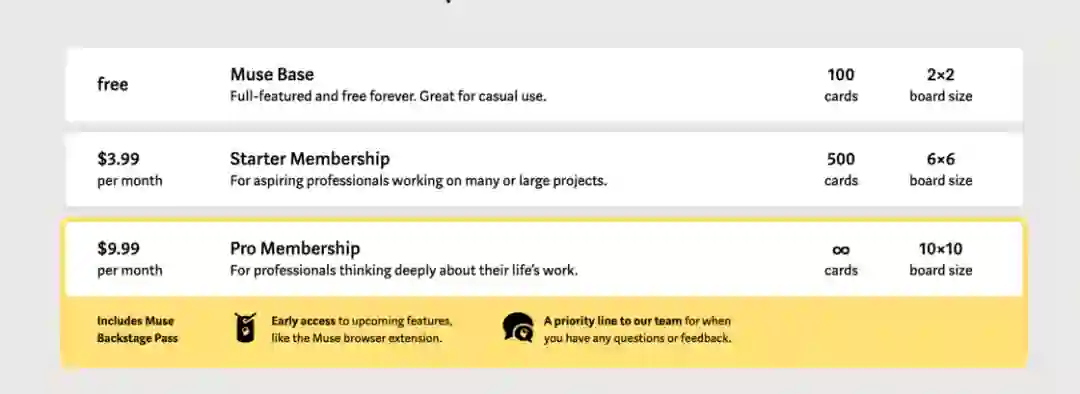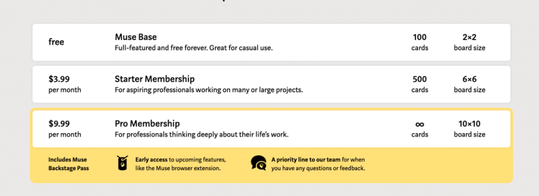 Muse 的 Pro 版本功能被设计得相当克制:免费版用户能创建的卡片总数被限制在了 100 个,而关于订阅内容部分 Muse 现在提供了两种不同等级的订阅方案,分别是能创建 500 张卡片的 Starter menbership 以及支持无限卡片创建的 Pro membership 方案。