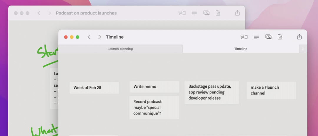 在卡片之下,Muse 还有层级更高的「画板」(Board)设定,你可以结合各种多任务手势操作,将各个散落的卡片,快速整理进不同的画板中。由于 Muse 中并没有类似 Photoshop、Final Cut Pro 中项目文件的概念,因此不同的画板,在 Muse 中也用于区分管理不同的项目进程。