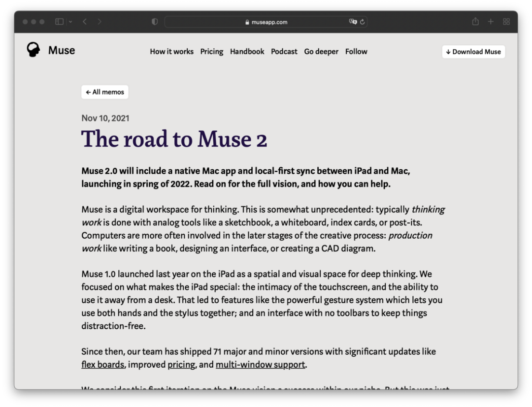 中也能看出,这就是一款为创作者「思考」过程服务,而非面向「生产」过程的工具。到了 2022 年六月已经发布了 2.0 版本,是 Muse 1.0 发布时隔两年之后推出的一次大版本更新。