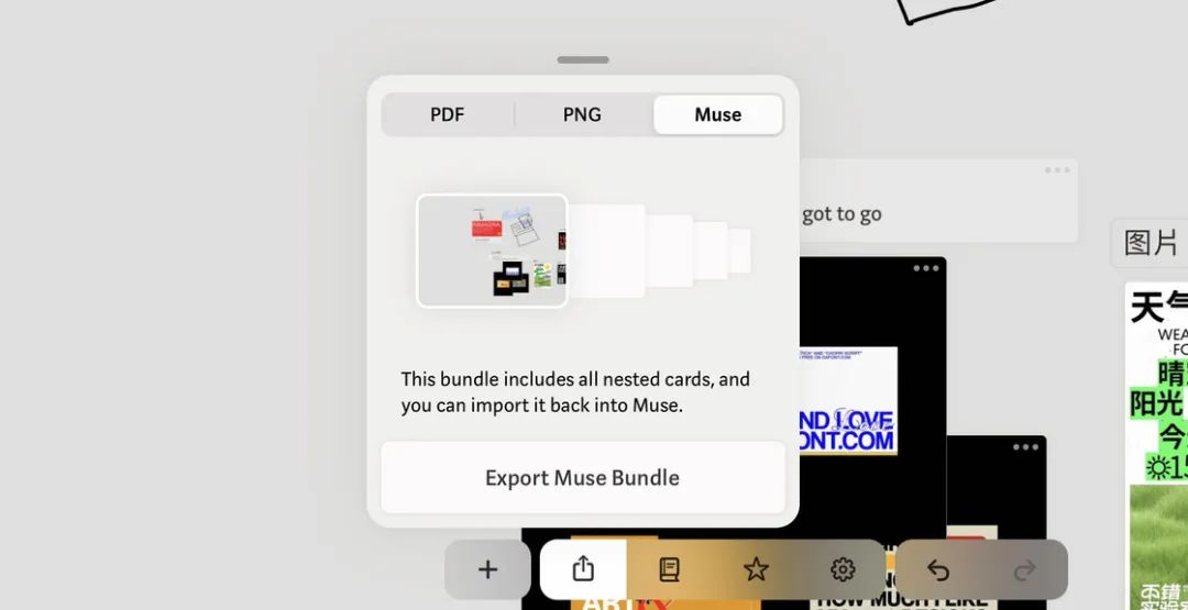 这里需要特别指出的是,在实际使用中卡片创建数量的限制往往不会有太大影响:如果仅仅是当作项目结束之后就擦掉的一块「白板」来使用的话,100 张卡片的数量已经足以应付大部分项目的头脑风暴与素材整理。项目结束之后,完全可以使用导出功能,在应用内导出 Muse 自有文件格式,在存档的同时,给新项目腾出足够的卡片空间。