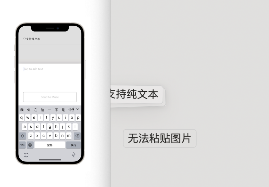 对了,其实 Muse 也有一个 iOS 版 App,但目前而言这个 iOS 版应用仅有的功能,只是将纯文本内容,以小纸条的形式投送到 iPadOS 与 macOS 版本的 Muse 上,仅此而已。