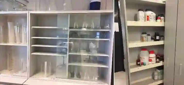 在上面的照片中可以看到,柜子中摆放着不同规格的实验器材,每个都贴着标签。器材使用过后只需放在水池旁的箱子中,实验助理会每天清洗,清洗干净后再归类摆放在柜子中。药品按照名称首字母进行编号,整齐规范地摆放在药品柜中,可以在电脑中查询你所需药品对应的CAS号,便能清楚地了解药品的摆放位置、对应的药品号码。这样良好的实验室规划,让学生也能更加高效地工作和研究。