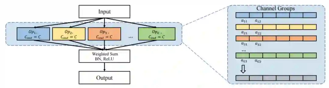 实际细想就是两个超参,每个卷积的dilation数值和group的分组数。学习的方式难免有局限,得益于强大的搜索算法,我们直接搜索了这两个超参,也算是比较早直接在channel 级别搜索的论文,具体可以看我们的NIPS论文。
