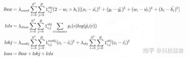 loss = 0for img in img_all:for i in range(3):for j in range(4):c_loss = lamda_1*(c_pred-c_label)**2geo_loss = c_label*(x_pred-x_label)**2 +\c_label*(y_pred-y_label)**2 + c_label*(w_pred-w_label)**2 + \c_label*(h_pred-h_label)**2class_loss = 1/m * mse_loss(p_pred, p_label)loss_ij =c_loss + geo_loss + class_lossloss += loss_ijloss.backward()