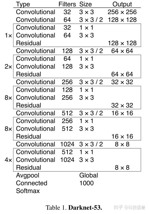 先声明下darknet 53指的是convolution层有52层+1个conv层把1024个channel调整为1000个,你会发现YOLO v2中使用的GAP层在YOLO v3中还在用,他还是在ImageNet上先train的backbone,