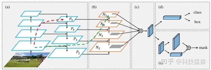 自下而上的路径由不到10层组成,浅层特征经过FPN的laterial connection连接到 ,再经过bottom-up path augmentation连接到顶层,经过的层数不到10层,能较好地保留浅层的信息。这里的绿色虚线就象征着自下而上的路径的不到10层。