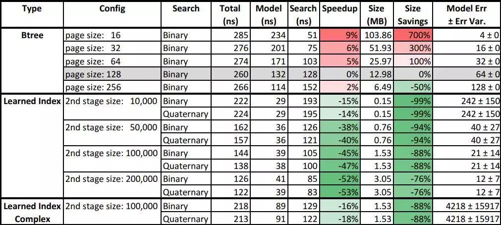 从上图可见,对于网络日志数据,机器学习索引带来的速度提升较高达到了53%,对应的体积也有76%的缩小,相比之下误差范围稍有加大。