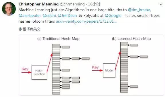 斯坦福大学Chirs Manning教授发表Twitter,评论称谷歌团队这篇论文用机器学习替代传统算法,而且“一口吃掉一大块”