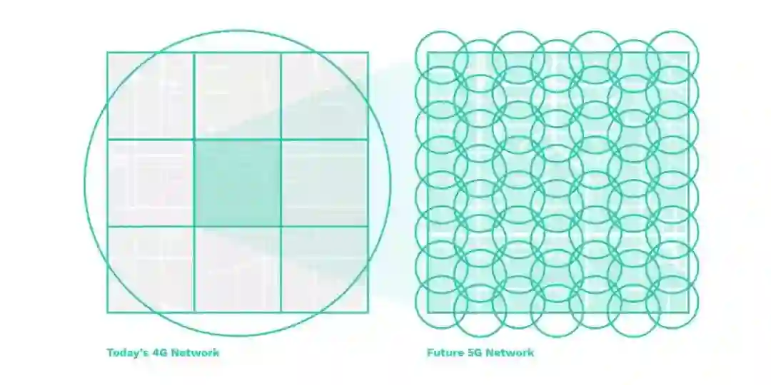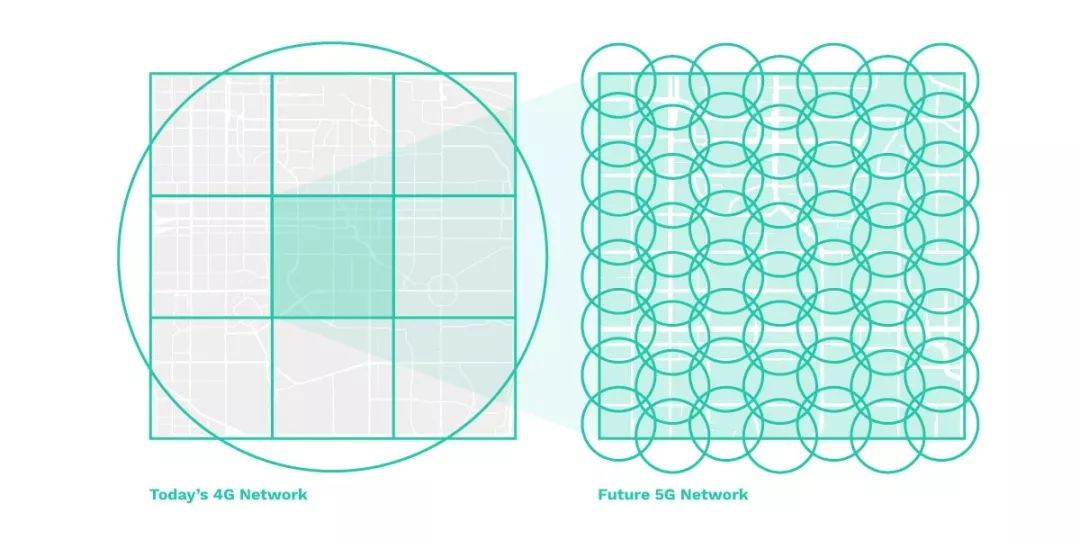 左图为一个 4G 单元覆盖的范围(25 平方公里);右图为覆盖 2.5 平方公里的范围大约所需的 5G 手机网络数目。