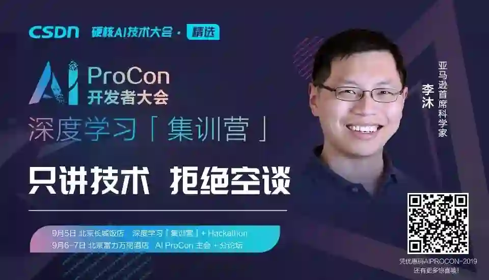 9.5-7日 AI 开发大会(AI ProCon),7位出品人集结国内外60+技术大咖,探秘9大核心技术,深剖行业痛点,亚马逊首席科学家李沐还将亲授「深度学习集训营」,助力开发者实现技术跃迁。