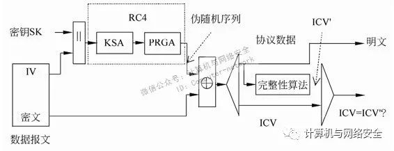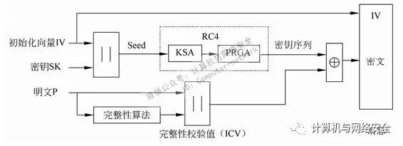 1)WEP协议工作在Mac层,从上层获得需要传输的明文数据后,首先使用CRC循环冗余校验序列进行计算。利用CRC算法将生成32位的ICV完整性校验值,并将明文和ICV组合在一起,作为将要被加密的数据。使用CRC的目的是使接收方可以发现在传输的过程中有没有差错产生。