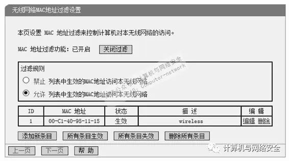 (6)从该界面可以看到,添加了一个新条目,且显示了该条目的ID号、Mac地址、状态和描述信息。如果需要修改,可以单击“编辑”按钮,即可进行修改。添加新条目后,不需要重新启动路由器,客户端就可以连接该网络。