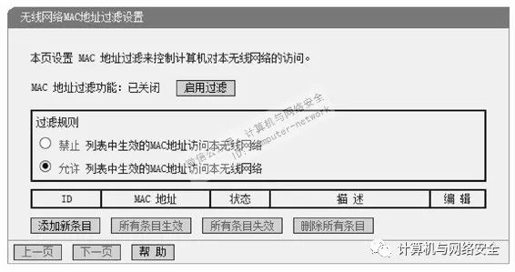 (3)从该界面可以看到,该路由器的Mac地址过滤功能是关闭的,这里首先单击“启用过滤”按钮开启该功能。然后选择过滤规则,并添加新条目(允许或禁止访问的客户端Mac地址)。如果禁止访问的客户端不多时,建议选择“禁止”过滤规则,这样可以减少用户输入的负担。反之话,选择“允许”过滤规则。