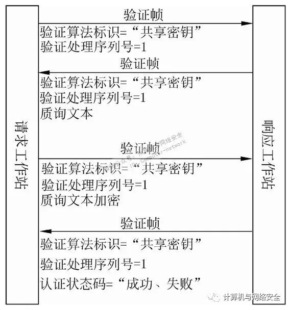 1)请求工作站发送认证管理帧。其帧体包括工作站声明标识=工作站的Mac地址、认证算法标识=共享密钥认证、认证事务序列号=1。