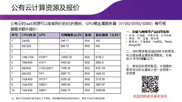 最后给大家提供一份公有云资源折扣和报价,如有需要欢迎扫码提交需求信息,或者后台留言,需要采购GPU卡的亦可后台留言。