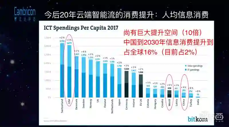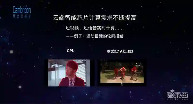 云端智能流的消费提升空间是非常巨大的,但是现在的计算系统还无法支撑未来种种消费升级的需求。比如说现在有非常多的实时计算需求(比如短视频、短语音),但由于有各种各样处理的程序进行加工,现在大家已经完全不能相信互联网上视频、语音的真实性了。现在有非常大量的训练和推理需求都是在云端进行的,但是传统的计算系统(CPU、GPU)在做图像识别加速的时候,训练的性能非常有限。原来用英特尔至强的CPU做人工智能快速检测算法,可能几秒钟处理1桢,现在华为手机上搭载了寒武纪1A,可以将其加速到每秒几十帧的程度,但这远远不够。
