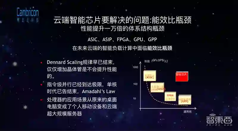 目前在云端智能处理方面要解决的问题最终可以归结为能效比的瓶颈问题。我们目前已有的芯片结构如ASIC、ASIP、FPGA、GPU、CPU,它们的能效大约集中在每秒100亿次到1万亿次的能效比区间,再往上提升是非常困难的。因为当芯片设计得越通用其能效越低,能效越高的话通用性就非常差。