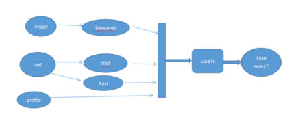 在这里清博AI团队使用了GDBT-based的模型,其中针对图像特征,使用densenet121预训练模型的最后一个全连接层的输出作为图像的语义特征。针对text文本字段使用了tfidf提取ngram特征。最后把图像的语义特征,ngram和bert提取的文本特征以及用户画像特征拼接到一起输入GDBT-based模型,进行训练,最终得到一个虚假新闻判断模型。