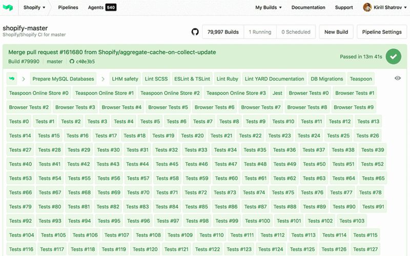 Shopify 单体大概有 10 万个单元测试,其中大部分涉及到繁重的 ORM 调用,因此运行得不是很快。为了保持快速的交付管道,我们在 CI 基础设施上进行了大量投入。我们使用 BuildKite 作为 CI 平台。BuildKite 的独特之处在于,它负责编排构建并提供用户界面,而用户可以在自己的硬件上按照自己的方式运行测试。