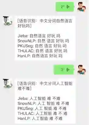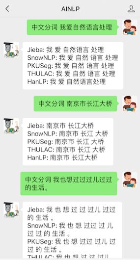 现在,可以拿起你的手机,对着AINLP公众号后台输入:中文分词 需要分词的内容,或者可以用语音输入:来,试试语音(识别)聊天(机器人)