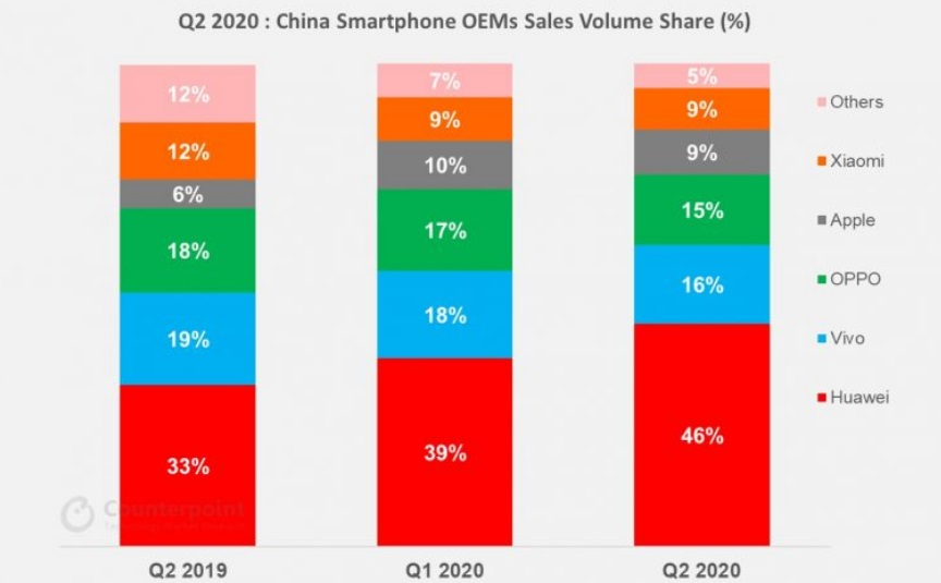 单以中国市场为例,近日知名分析机构 Counterpoint 发布 Q2 中国智能手机市场分析报告显示,华为手机市场份额达到 46%,排名第一位,其次是Vivo,OPPO,苹果和小米。