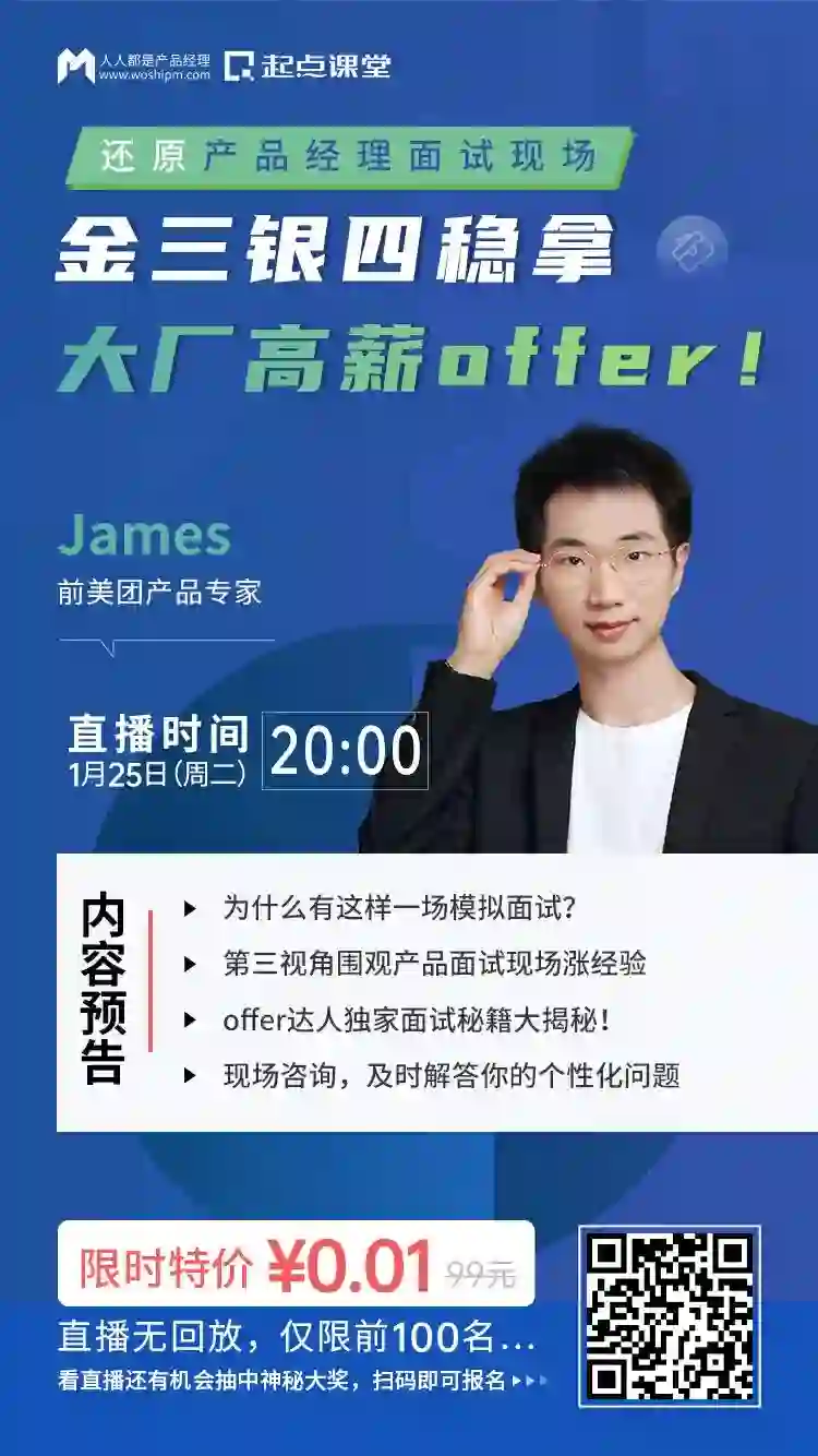 01月25日(周二)晚上20:00 前美团产品专家@James 将会上线为大家带来满满干货的直播课程哦!