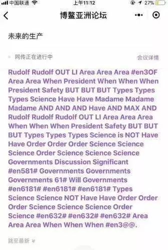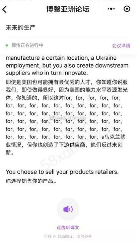 该同传产品在当时主要负责为博鳌论坛的开幕式及部分核心论坛提供同声传译支持,其中包括同传双语内容会议现场投屏、同传内容手机小程序查看、翻译结果语音收听、同传记录回放等。结果会议才开始没多久,网上就爆出同传产品「掉链子」的消息,其中集中出现的问题分别是「大面积单词无意义重复、大小写及字符混乱」和「中英双语切换频率」,比如在一片中文翻译中出现大量无意义的英文单词「for」。