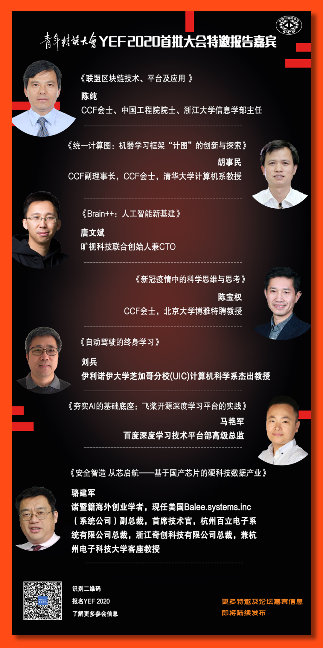 陈纯院士、倪光南院士、胡事民、唐文斌、陈宝权、刘兵、陈云霁、陈怡然、钱德沛、史元春…..50+计算领域的顶级专家学者将同时出现在YEF2020的大会现场,通过大会特邀报告、技术及观点论坛、思想秀等分享他们的研究成果、前沿思想和技术观点。一次不可错过的高规格科技盛宴,速通过下方二维码参会报名!