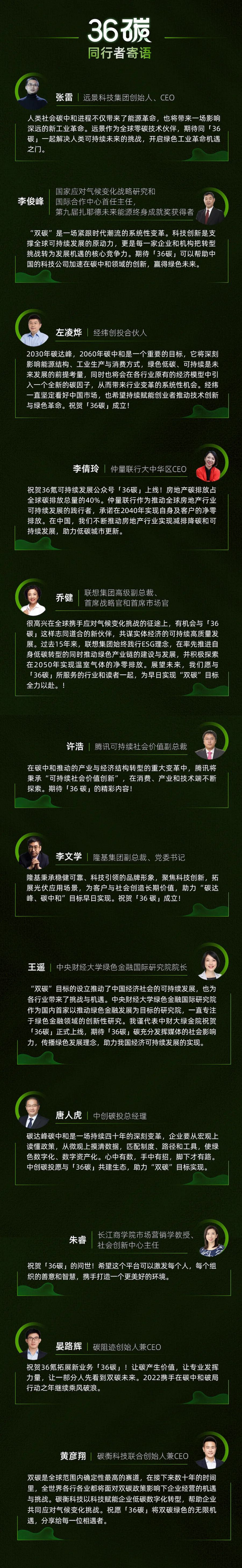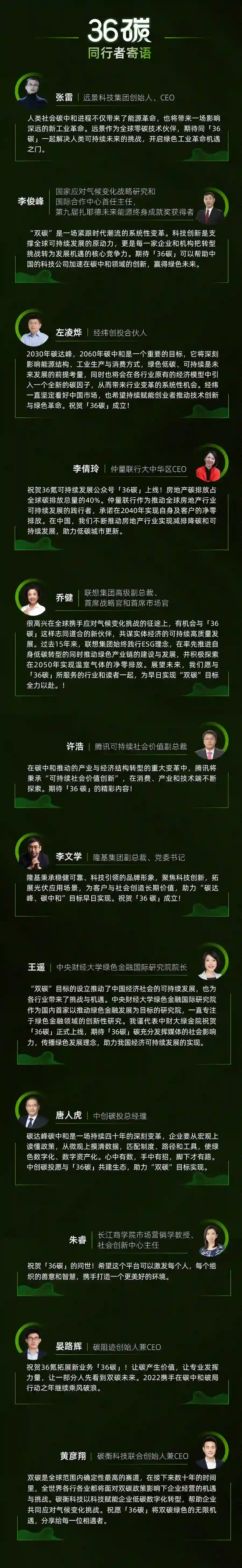 筹备公众号期间,我们储备了多篇重磅内容,之后会陆续首发在 36 碳中;另外,在这个尚且新兴的领域里,我们还找到了一批同样以“双碳与ESG”为目标的同行人,希望能用媒体的细微触角,串联起产业里的点点星火。(为了不影响您的阅读体验,我们将这些同行者对 36 碳的寄语放在了文末)