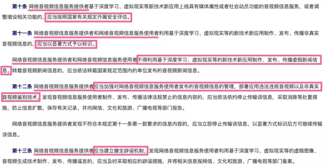 《规定》中第十条至第十三条均针对利用深度学习、虚拟现实等,新技术制作的非真实音视频进行了规定