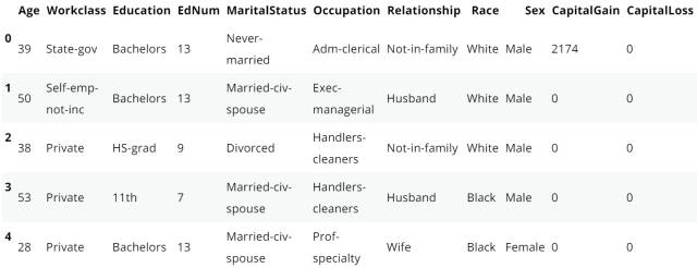 为了展示不同的前文所述的决策树模型,我们将使用 Kaggle 上的美国收入数据集,我们都可以在 Kaggle.com 上下载该数据集。下面的代码可以展示该数据集的导入过程和部分内容: