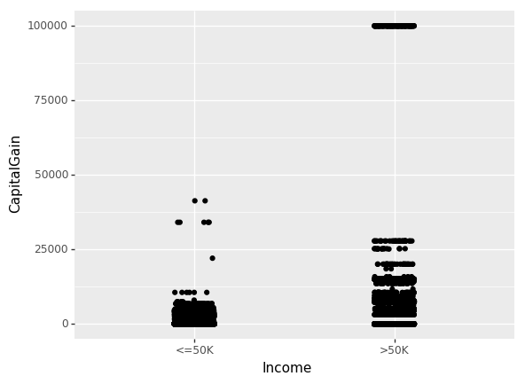 (ggplot(df_train_set, aes(x="Income", y="CapitalGain"))+ geom_jitter(position=position_jitter(0.1)))