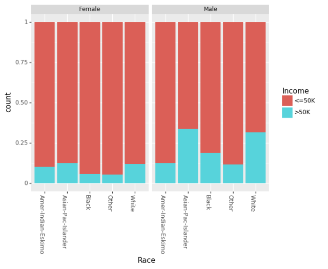 (ggplot(df_train_set, aes(x = "Race", fill = "Income"))+ geom_bar(position="fill")+ theme(axis_text_x = element_text(angle = -90, hjust = 1))+ facet_wrap('~Sex'))