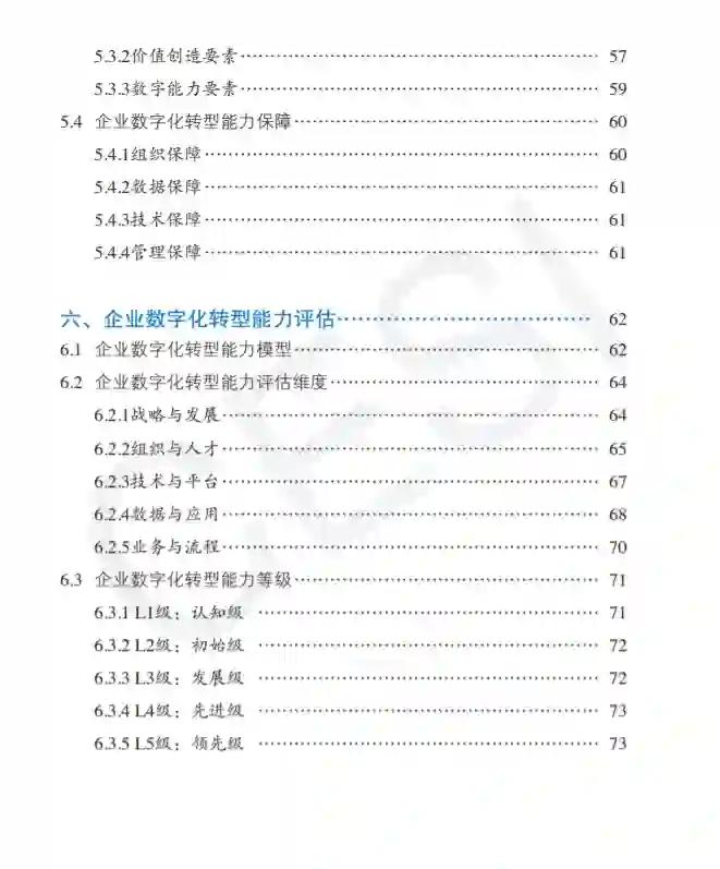(5)企业数字化转型能力评估,说明了能力评估模型、等级、方法等。