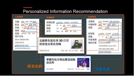 第一,理解人。我们要用机器学习技术去理解这个人的兴趣爱好,他的年龄、性别,他过去读了哪些文章等等,这些组合起来会刻画出他兴趣方面完整的画像。